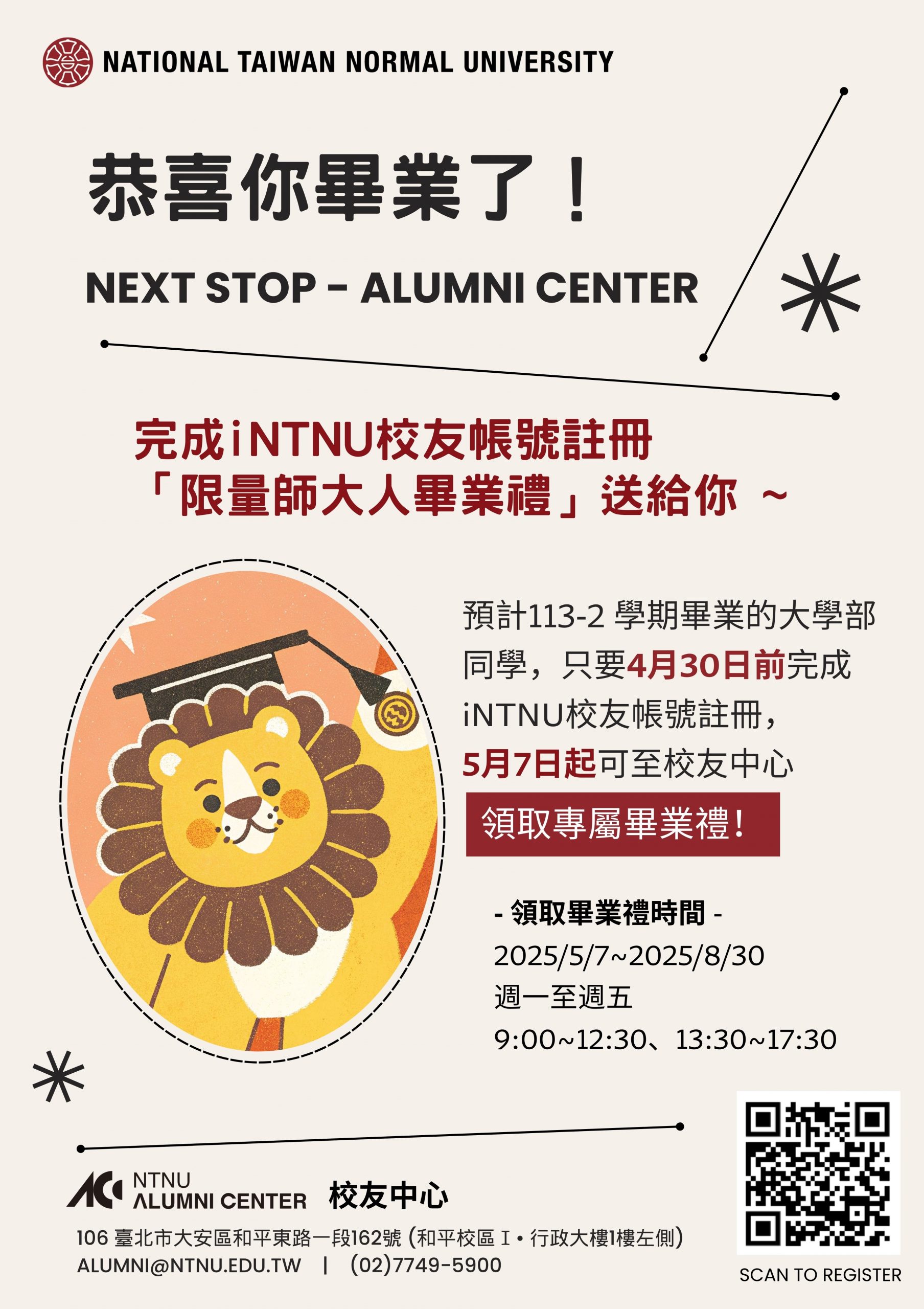 大學部大四以上,預計113-2學期畢業的同學於4/30前完成 iNTNU校友註冊,畢業生於5月7日起可至校友中心「和平校區Ⅰ-行政大樓1樓左側」領取專屬畢業禮。